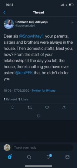 Deji took to Twitter to ask Precious when and how did FFK abuse her, if the abuse happened when she was pregnant or when her siblings and family members were living. He said her family members were always around in FFK’s home.