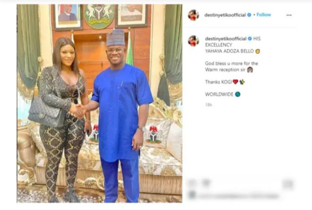 Nigerians have dragged popular actress, Destiny Etiko over the outfit she wore to visit the Governor of Kogi state, Yahaya Bello.