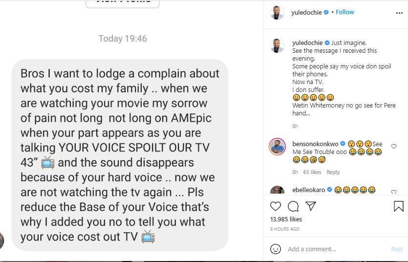 In a message sent to him by a fan on Instagram, the fan had accused Edochie of spoiling his TV with his voice while they were watching one of the movies he acted titled, “My sorrow of pain”.