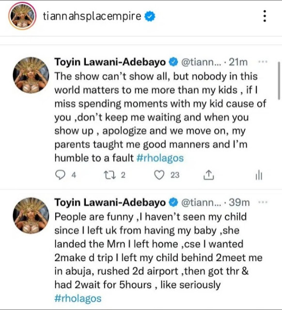 “No Room for Bad Manners, Love me or hate me, I say how I feel, I don’t sugar coat anything, You must be God himself for you to make me miss out on anything important that has to do with my kids and you then come with an attitude, wo lo sun, I can’t even be your mother, I’m not done training my own kids, na who I wan come school. The way my parents raised me when I’m late to anywhere, I say sorry for keeping you all waiting, before anything else, like seriously 5hours and same thing a week before, you must be God then, I didn’t address one person, I addressed both women, so anyone that carried the matter on head like the gala is free, even when we all made up after and laughed SMH. When you know what it takes to leave my new born baby I’m nursing at home and travel then come talk to me”.